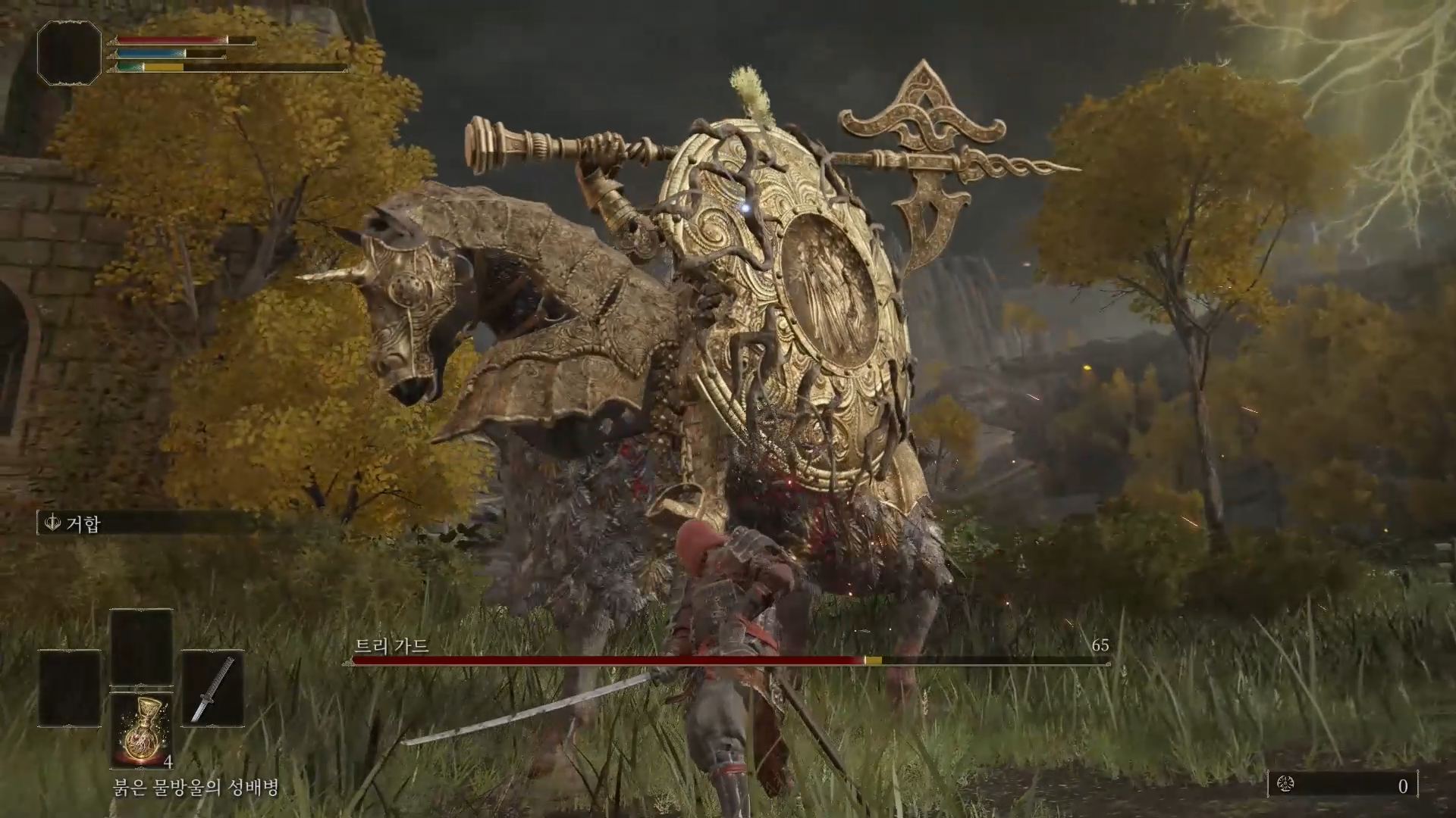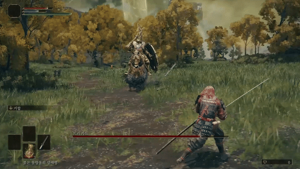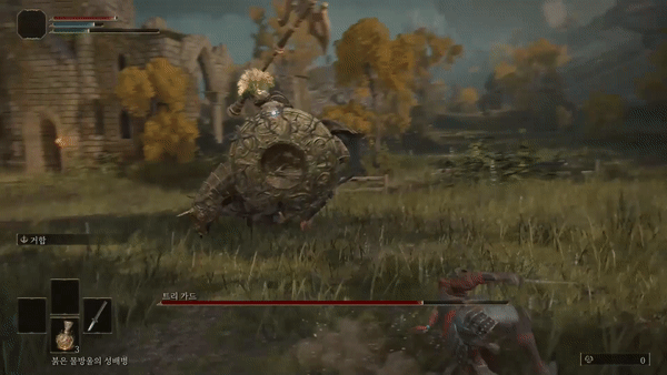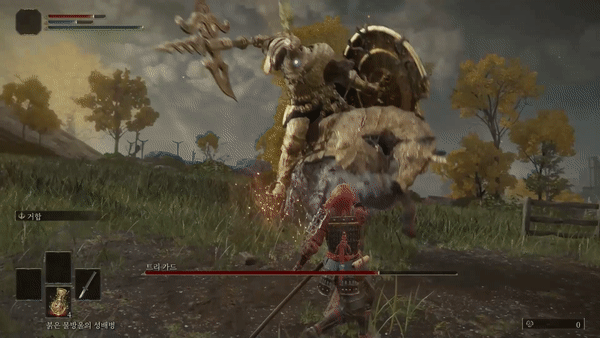 앞의 모든 패턴에서 플레이어가 공격 후 트리가드가 앞 발을 들어올려 공격하는 패턴이 이어서 나올 수 있는데 발을 들어올린다면 말의 머리쪽으로 두 번 굴러주고 두 번 더 때려주면 돼요